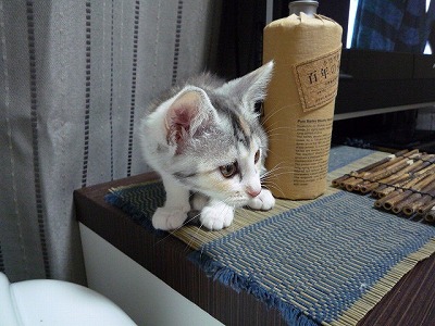 ▼監視交代。モモ監視員、未確認じゃらしに手がなかなか届かない。