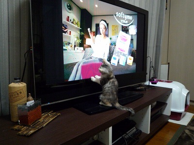 このようにテレビ台は床よりも多少高い位置にあるため獲物探すのに都合がよいらしい・・・Σ(゚Д゚)
